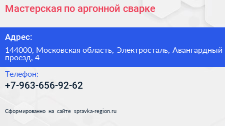 Мастерская по аргонной сварке по адресу 144000, Московская область, Электросталь, Авангардный проезд, 4 в дальнейшем Организация, размещена в следующих категориях: