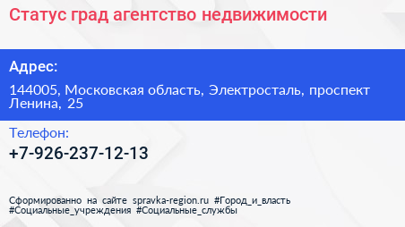 Статус-град, агентство недвижимости по адресу 144005, Московская область, Электросталь, проспект Ленина, 25 в дальнейшем Организация, размещена в следующих категориях: