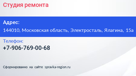 Студия ремонта по адресу 144010, Московская область, Электросталь, Ялагина, 15а в дальнейшем Организация, размещена в следующих категориях: