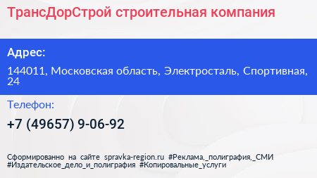 ТрансДорСтрой, строительная компания по адресу 144011, Московская область, Электросталь, Спортивная, 24 в дальнейшем Организация, размещена в следующих категориях: