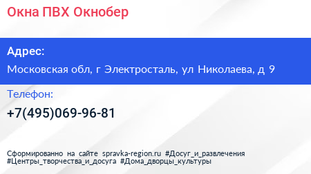 Окна ПВХ Окнобер по адресу Московская обл, г Электросталь, ул Николаева, д 9 в дальнейшем Организация, размещена в следующих категориях: