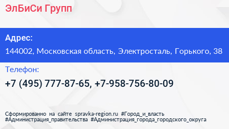 ЭлБиСи Групп по адресу 144002, Московская область, Электросталь, Горького, 38 в дальнейшем Организация, размещена в следующих категориях: