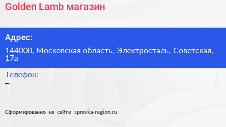 Golden Lamb, магазин по адресу 144000, Московская область, Электросталь, Советская, 17а в дальнейшем Организация, размещена в следующих категориях: