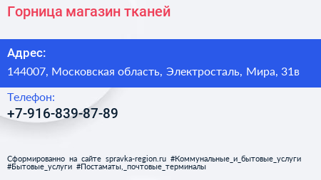 Горница, магазин тканей по адресу 144007, Московская область, Электросталь, Мира, 31в в дальнейшем Организация, размещена в следующих категориях: