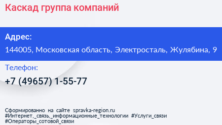 Каскад, группа компаний по адресу 144005, Московская область, Электросталь, Жулябина, 9 в дальнейшем Организация, размещена в следующих категориях: