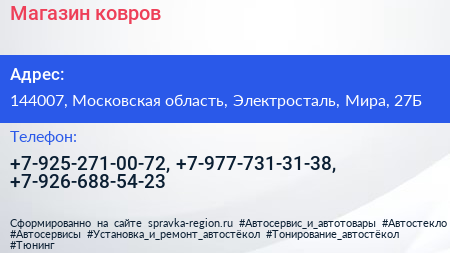 Магазин ковров по адресу 144007, Московская область, Электросталь, Мира, 27Б в дальнейшем Организация, размещена в следующих категориях:
