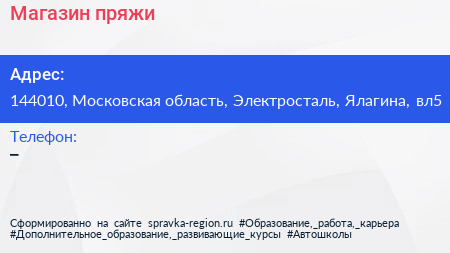 Магазин пряжи по адресу 144010, Московская область, Электросталь, Ялагина, вл5 в дальнейшем Организация, размещена в следующих категориях: