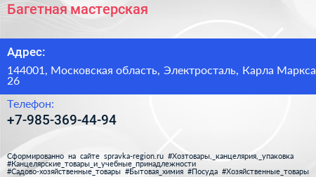 Багетная мастерская по адресу 144001, Московская область, Электросталь, Карла Маркса, 26 в дальнейшем Организация, размещена в следующих категориях: