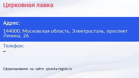 Церковная лавка по адресу 144000, Московская область, Электросталь, проспект Ленина, 26 в дальнейшем Организация, размещена в следующих категориях: