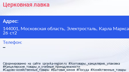 Церковная лавка по адресу 144001, Московская область, Электросталь, Карла Маркса, 26 ст2 в дальнейшем Организация, размещена в следующих категориях: