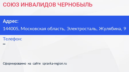 СОЮЗ ИНВАЛИДОВ ЧЕРНОБЫЛЬ по адресу 144005, Московская область, Электросталь, Жулябина, 9 в дальнейшем Организация, размещена в следующих категориях: