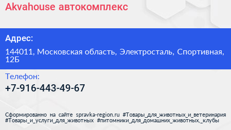 Akvahouse, автокомплекс по адресу 144011, Московская область, Электросталь, Спортивная, 12Б в дальнейшем Организация, размещена в следующих категориях: