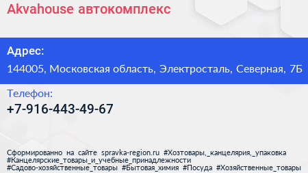 Akvahouse, автокомплекс по адресу 144005, Московская область, Электросталь, Северная, 7Б в дальнейшем Организация, размещена в следующих категориях: