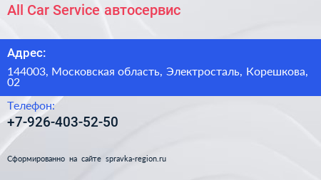 All Car Service, автосервис по адресу 144003, Московская область, Электросталь, Корешкова, 02 в дальнейшем Организация, размещена в следующих категориях: