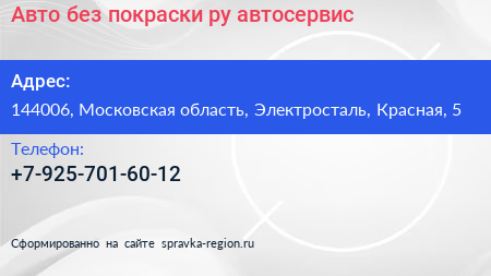 Авто-без-покраски.ру, автосервис по адресу 144006, Московская область, Электросталь, Красная, 5 в дальнейшем Организация, размещена в следующих категориях: