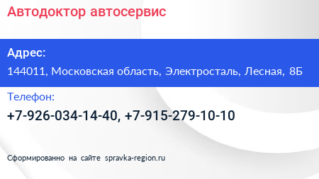 Автодоктор, автосервис по адресу 144011, Московская область, Электросталь, Лесная, 8Б в дальнейшем Организация, размещена в следующих категориях: