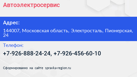 Автоэлектросервис по адресу 144007, Московская область, Электросталь, Пионерская, 24 в дальнейшем Организация, размещена в следующих категориях: