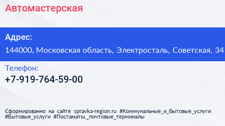 Автомастерская по адресу 144000, Московская область, Электросталь, Советская, 34 в дальнейшем Организация, размещена в следующих категориях: