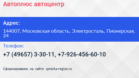 Автоплюс, автоцентр по адресу 144007, Московская область, Электросталь, Пионерская, 24 в дальнейшем Организация, размещена в следующих категориях: