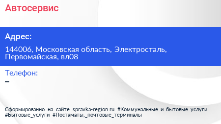 Автосервис по адресу 144006, Московская область, Электросталь, Первомайская, вл08 в дальнейшем Организация, размещена в следующих категориях: