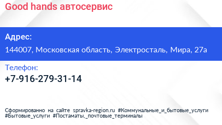Good hands, автосервис по адресу 144007, Московская область, Электросталь, Мира, 27а в дальнейшем Организация, размещена в следующих категориях: