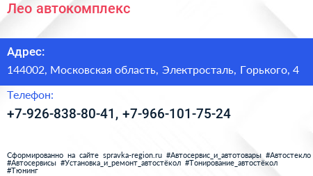Лео, автокомплекс по адресу 144002, Московская область, Электросталь, Горького, 4 в дальнейшем Организация, размещена в следующих категориях: