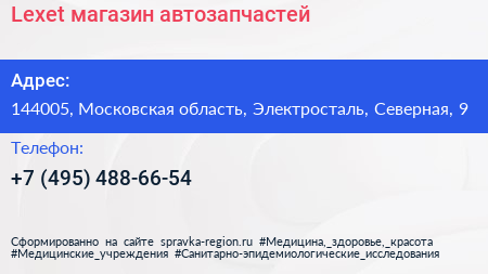 Lexet, магазин автозапчастей по адресу 144005, Московская область, Электросталь, Северная, 9 в дальнейшем Организация, размещена в следующих категориях: