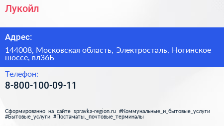 Лукойл по адресу 144008, Московская область, Электросталь, Ногинское шоссе, вл36Б в дальнейшем Организация, размещена в следующих категориях: