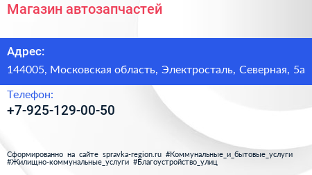 Магазин автозапчастей по адресу 144005, Московская область, Электросталь, Северная, 5а в дальнейшем Организация, размещена в следующих категориях: