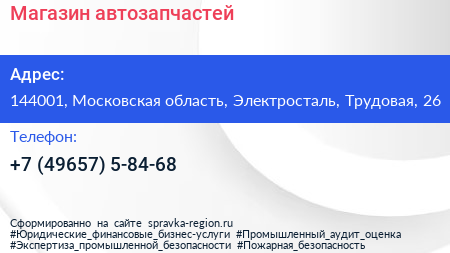 Магазин автозапчастей по адресу 144001, Московская область, Электросталь, Трудовая, 26 в дальнейшем Организация, размещена в следующих категориях: