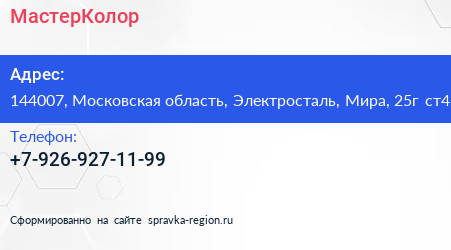 МастерКолор по адресу 144007, Московская область, Электросталь, Мира, 25г ст4 в дальнейшем Организация, размещена в следующих категориях: