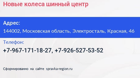 Новые колеса, шинный центр по адресу 144002, Московская область, Электросталь, Красная, 46 в дальнейшем Организация, размещена в следующих категориях: