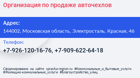 Организация по продаже авточехлов по адресу 144002, Московская область, Электросталь, Красная, 46 в дальнейшем Организация, размещена в следующих категориях: