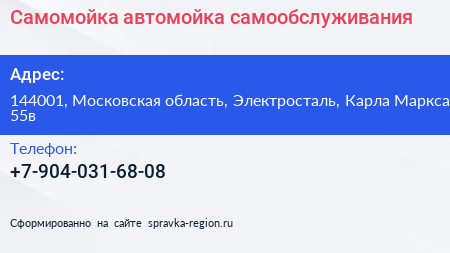 Самомойка, автомойка самообслуживания по адресу 144001, Московская область, Электросталь, Карла Маркса, 55в в дальнейшем Организация, размещена в следующих категориях: