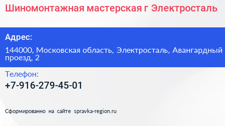 Шиномонтажная мастерская, г. Электросталь по адресу 144000, Московская область, Электросталь, Авангардный проезд, 2 в дальнейшем Организация, размещена в следующих категориях: