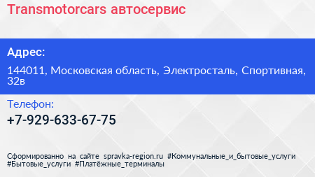 Transmotorcars, автосервис по адресу 144011, Московская область, Электросталь, Спортивная, 32в в дальнейшем Организация, размещена в следующих категориях: