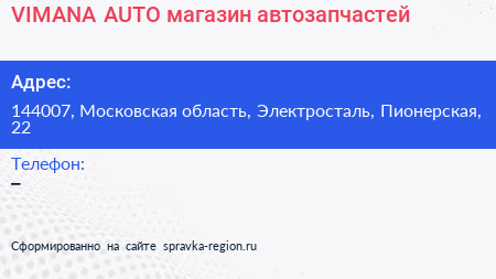 VIMANA AUTO, магазин автозапчастей по адресу 144007, Московская область, Электросталь, Пионерская, 22 в дальнейшем Организация, размещена в следующих категориях: