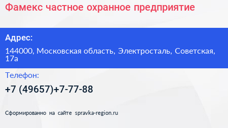 Фамекс, частное охранное предприятие по адресу 144000, Московская область, Электросталь, Советская, 17а в дальнейшем Организация, размещена в следующих категориях: