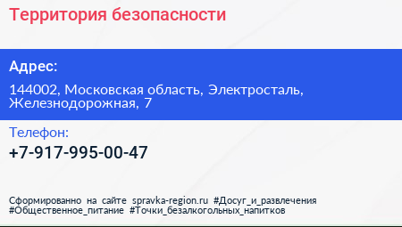 Территория безопасности по адресу 144002, Московская область, Электросталь, Железнодорожная, 7 в дальнейшем Организация, размещена в следующих категориях: