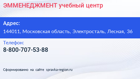 ЭММЕНЕДЖМЕНТ, учебный центр по адресу 144011, Московская область, Электросталь, Лесная, 36 в дальнейшем Организация, размещена в следующих категориях: