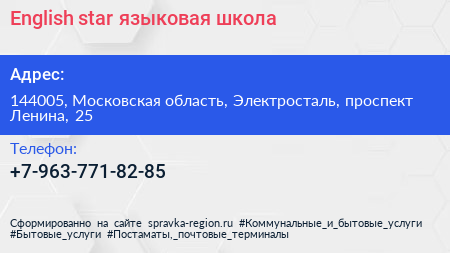 English star, языковая школа по адресу 144005, Московская область, Электросталь, проспект Ленина, 25 в дальнейшем Организация, размещена в следующих категориях: