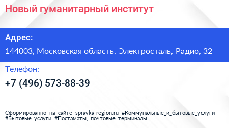 Новый гуманитарный институт по адресу 144003, Московская область, Электросталь, Радио, 32 в дальнейшем Организация, размещена в следующих категориях: