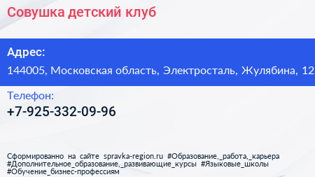 Совушка, детский клуб по адресу 144005, Московская область, Электросталь, Жулябина, 12 в дальнейшем Организация, размещена в следующих категориях: