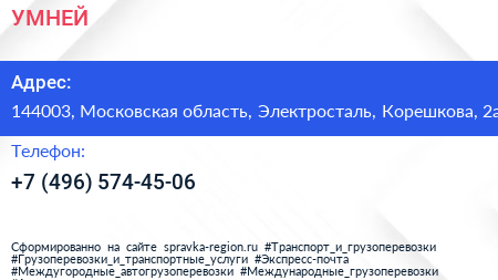 УМНЕЙ по адресу 144003, Московская область, Электросталь, Корешкова, 2а в дальнейшем Организация, размещена в следующих категориях:
