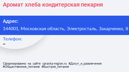 Аромат хлеба, кондитерская-пекарня по адресу 144001, Московская область, Электросталь, Захарченко, 8 в дальнейшем Организация, размещена в следующих категориях: