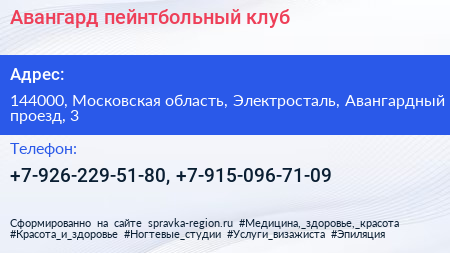 Авангард, пейнтбольный клуб по адресу 144000, Московская область, Электросталь, Авангардный проезд, 3 в дальнейшем Организация, размещена в следующих категориях: