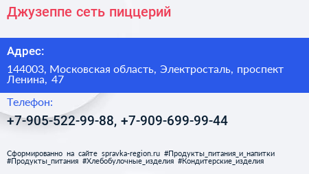 Джузеппе, сеть пиццерий по адресу 144003, Московская область, Электросталь, проспект Ленина, 47 в дальнейшем Организация, размещена в следующих категориях: