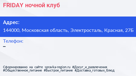 FRIDAY, ночной клуб по адресу 144000, Московская область, Электросталь, Красная, 27Б в дальнейшем Организация, размещена в следующих категориях: