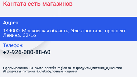 Кантата, сеть магазинов по адресу 144000, Московская область, Электросталь, проспект Ленина, 32/16 в дальнейшем Организация, размещена в следующих категориях:
