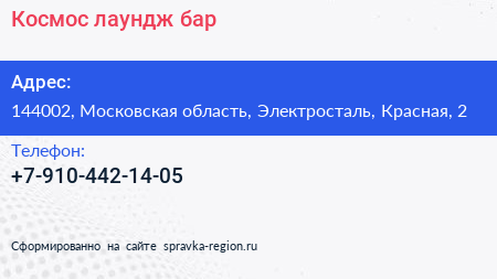 Космос, лаундж-бар по адресу 144002, Московская область, Электросталь, Красная, 2 в дальнейшем Организация, размещена в следующих категориях: